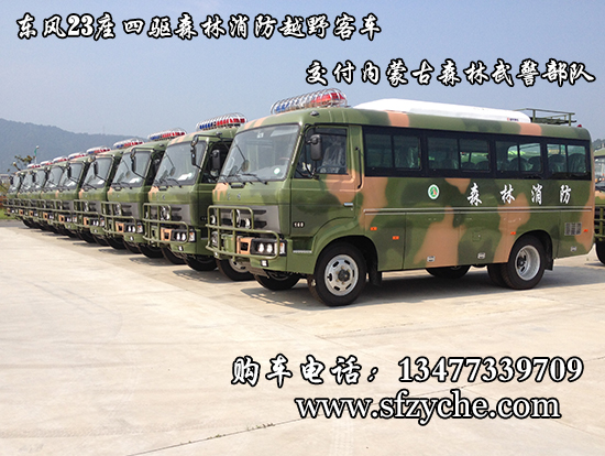 東風(fēng)23座四驅(qū)森林消防專用運(yùn)兵車型號為EQ6680ZTV,采用軍工東風(fēng)EQ6650KZ5T 三類底盤,發(fā)動(dòng)機(jī)型號:ISD160 50康明斯160馬力國五排放,變速箱為手動(dòng)六檔變速箱,整車外形尺寸長寬高(6800X2320X2800,3010)mm 驅(qū)動(dòng)形式:4×4,離合助力,方向助力,斷氣剎,鼓式自動(dòng),車橋?yàn)闁|風(fēng)德納,輪胎為7.50R20鋼絲胎,外行李架,工具箱3個(gè),前置防裝杠,粘接式推拉玻璃,鋁花紋地板,中檔座椅,,手動(dòng)式外擺門,153駕駛室正副司機(jī)門,獨(dú)立柴油鍋爐暖風(fēng)機(jī)帶四個(gè)出風(fēng)口,窗簾,滅火器兩個(gè),備胎一個(gè)。選裝頂置派恩大功率空調(diào)機(jī)組。