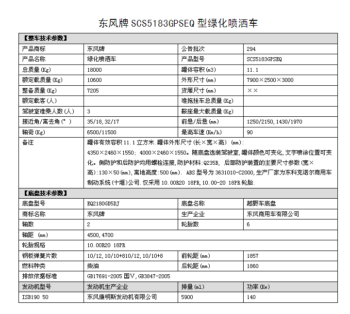 潤知星牌SCS5183GPSEQ四驅(qū)越野消防灑水車,東風(fēng)越野四驅(qū)森林消防供水車采用東風(fēng)D913新款駕駛室(可選裝老款153駕駛室),4*4驅(qū)動,ISB190 50國五發(fā)動機,4500mm/4700mm軸距,東風(fēng)六檔變速箱,10.00R20鋼絲胎,東風(fēng)商用車前后橋,罐體采用優(yōu)質(zhì)碳鋼QB235板材,罐體容積11.1立方,前沖后灑,側(cè)噴,后置工作平臺帶消防水炮,可選裝消防炮,消防泵等專用消防設(shè)備。主要用途:中國森林林業(yè)部門的森林消防滅火供水及利用車載消防泵消防炮進行遠(yuǎn)程消滅森林火災(zāi)。
