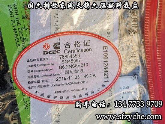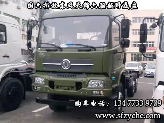 國六排放東風天錦六驅越野底盤,東風天錦D530一排半駕駛室,6×6驅動,康明斯B6.2NS6B210國六發(fā)動機210馬力,最大扭矩:850N.m/1100-1700rpm,排量6.2L、韶齒手動六檔變速箱,東風德納車橋,前驅動橋4.5噸,中后橋都為軍工德納4.5噸驅動橋,大花紋越野輪胎,軸距3500+1250mm,電動玻璃,方向助力,斷氣剎,ABS,大燈自動調節(jié),自動調整臂,選裝原廠空調。