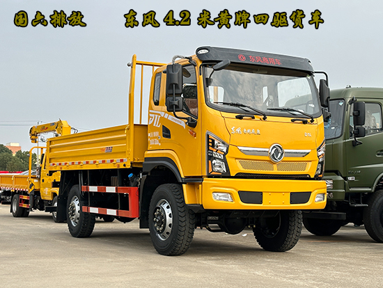 東風(fēng)黃牌4.2米原廠四驅(qū)貨車(chē),DFV1101GP6D型四驅(qū)載貨汽車(chē),該車(chē)驅(qū)動(dòng)形式為4×4全輪驅(qū)動(dòng),采用東風(fēng)牌DFV5101TGP6DJ型特種作業(yè)底盤(pán),采用東風(fēng)D1L一排半駕駛室?guī)г瓘S空調(diào),4×4驅(qū)動(dòng),選裝玉柴YCY30170-60和玉柴YCS04180-60發(fā)動(dòng)機(jī),韶齒五檔變速箱,杭齒450分動(dòng)箱帶高低擋,分時(shí)四驅(qū),軸距:3500mm,295/80R22.5越野輪胎,4T前橋,8T后橋,電動(dòng)玻璃,方向助力,斷氣剎,帶ABS。車(chē)廂長(zhǎng)4.2米,整車(chē)長(zhǎng)6.05米,接近角33度,離去角17度,最小離地間隙35公分,涉水深度0.8米。
