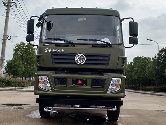 采用東風(fēng)EQ2180GD5DJ型越野汽車底盤(pán),東風(fēng)一排半寬體駕駛室,4×4驅(qū)動(dòng),康明斯ISB190 50國(guó)五發(fā)動(dòng)機(jī),六檔變速箱,東風(fēng)商用車橋,前驅(qū)動(dòng)橋3.8噸,后橋10噸,10.00R20輪胎,軸距4500mm,電動(dòng)玻璃,方向助力,斷氣剎,ABS。罐體采用優(yōu)質(zhì)碳鋼QB235板材,板材厚度4mm,罐體容積11.1立方,變速箱安裝取力器,大功率水泵可泵進(jìn)泵出,后置工作平臺(tái)帶水炮射程25米,消防栓接口左右各一個(gè),選裝駕駛室頂部安裝長(zhǎng)條警燈帶喊話器,全車顏色軍綠,兩側(cè)噴涂白色森林消防字樣。