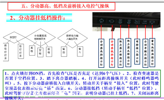 1、點火鎖打到ON檔,首先檢查氣壓是否充足(達到6個氣壓)。2、檢查變速器是否置于空檔位置。3、踏下離合器踏板。4、打開遠距離操縱開關(此時蜂鳴器鳴叫)。5、按下分動器前橋接入自鎖開關,轉動開關手柄至“接入”位置,此時駕駛室頂蓋儀表指示燈亮“橋”圖案。6、分動器接低檔(轉動手柄至“低檔”位置)。此時駕駛室頂蓋儀表指示燈亮“龜”圖案,表明分動器已掛上低檔。7、關閉遠距離操縱開關。