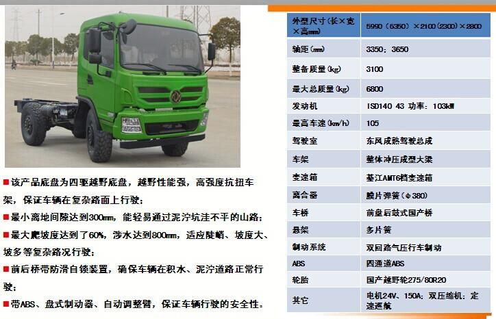 EQ2070GZ4DJ越野四驅底盤的詳細描述:該產品底盤為四驅越野底盤,越野性能強,高強度抗扭車架,保證車輛在復雜路面上行駛時,不會出現(xiàn)大梁斷裂等情況;最小離地間隙達到300mm,能輕易通過泥濘坑洼不平的山路;最大爬坡度達到了60%,適應陡峭、坡度大、坡多等復雜路況行駛。前后橋帶防滑自鎖裝置,確保車輛在積水、泥濘道路正常行駛;帶ABS、盤式制動器、自動調整臂,保證車輛行駛的安全性。