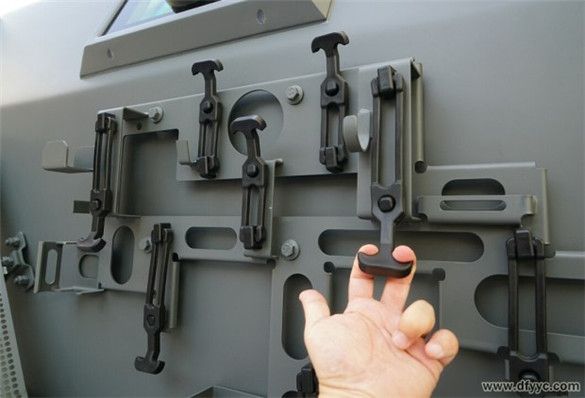 上圖是東風(fēng)四驅(qū)防雷反恐戰(zhàn)車右前側(cè)圍懸掛附加工具或補(bǔ)給品的懸掛特寫(xiě)。用手較費(fèi)勁的抻拉橡膠懸掛鎖具。備用工具通過(guò)橡膠掛具與背板固定在車身側(cè)面,背板拆卸后可以成為盤(pán)等工具。