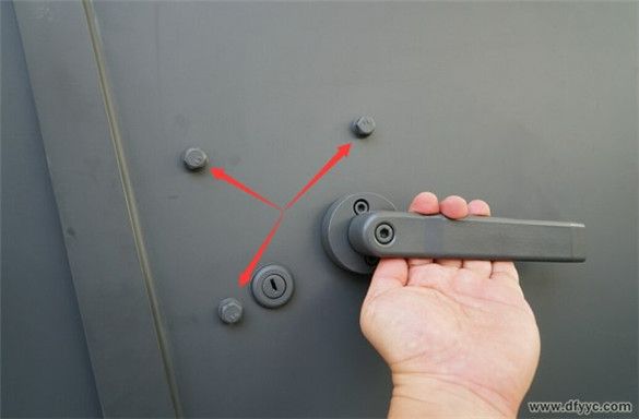 外拉手由上向下旋轉(zhuǎn)開(kāi)啟,并采用一字鎖鑰匙鎖閉。紅色箭頭所指的是固定車門鎖具的螺栓。