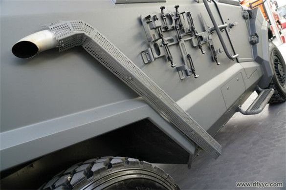 無(wú)論外觀還是尺寸,東風(fēng)四驅(qū)防雷反恐戰(zhàn)車都高于猛士系列裝甲車,幾乎與大疆系列反恐安全車相當(dāng)。三車門的設(shè)定,便于正副駕駛員與戰(zhàn)斗班組快速進(jìn)出裝備。排氣管從車身中段經(jīng)過(guò)右后側(cè)圍延伸車體外,使其不經(jīng)準(zhǔn)備就可在兩棲涉水工況下完成相關(guān)機(jī)動(dòng)動(dòng)作。
