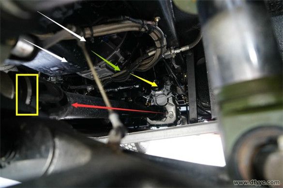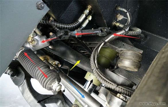 東風(fēng)四驅(qū)裝甲防雷反恐戰(zhàn)車為前置動(dòng)力、實(shí)時(shí)四輪驅(qū)動(dòng)設(shè)定,縱置發(fā)動(dòng)機(jī)(白色箭頭)直接與變速器(綠色箭頭)剛性連接,通過中間傳動(dòng)軸(黃色箭頭)至分動(dòng)器,在經(jīng)過前傳動(dòng)軸(紅色箭頭)與后傳動(dòng)軸將動(dòng)力輸出至前后驅(qū)動(dòng)橋。